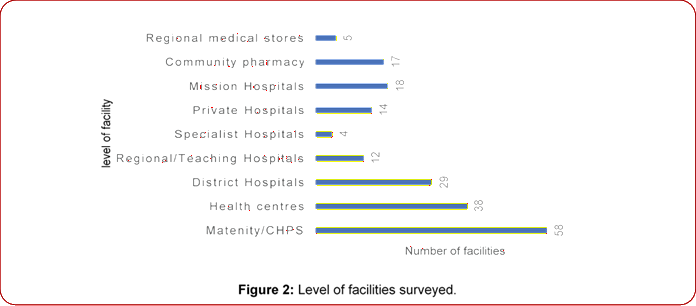Figure 2: Level of facilities surveyed. private hospitals; community pharmacies and regional medical stores. The most reviewed facility type was CHPS compounds followed by health centres and the district hospitals.