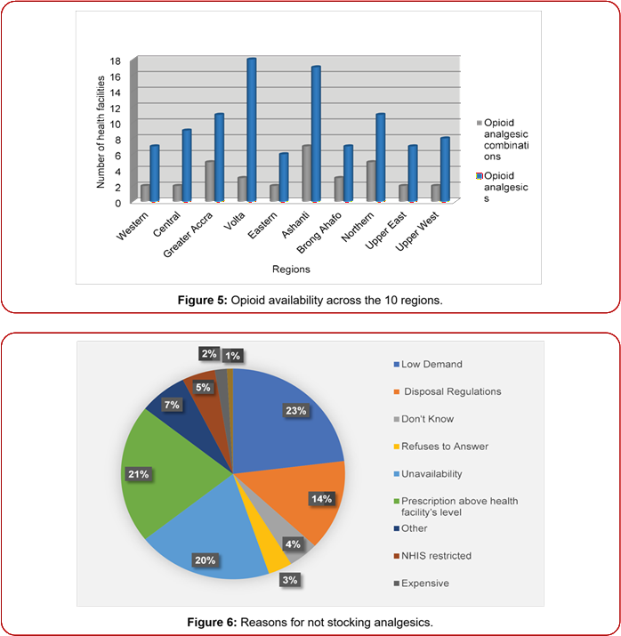 Chronic pain is among the most common causes of morbidity and disability worldwide and significantly associated with chronic diseases like cancer and HIV/AIDS [1]. It also remains the most compelling reason for health seeking and medical consultations globally [2,3]. Pain can also significantly impact the quality of life through its effect on loss of strength, reduced mobility and can interfere with a person’s ability to eat, concentrate, sleep, or interact with others [4]. The effects of pain whether physical or psychological can significantly influence the progression of diseases and indirectly lead to deteriorating outcomes [5]. Pain is a constant feature of chronic conditions; failure or inability to manage and treat pain has been regarded globally as an abrogation of a fundamental human right [4] and considered a global public health problem [6]. In light of this, international organizations, such as the United Nations Economic and Social Council and the World Health Assembly, have also called on countries to ensure adequate availability of opioid analgesics and other pain medications [7,8]. Despite calls for the availability of pain medications to ensure the prompt and effective management of pain, an estimated 5 billion of the world’s population in 2009 had no or insufficient access to treatment of moderate to severe pain [9]. In 2014, the WHO estimated that, 80% of the global population had insufficient access to appropriate opioid analgesics for pain management [10]. Other studies globally have documented relatively low levels of usage of opioids analgesics and other pain medications for pain management in sub-Saharan Africa compared to other parts of the world particularly Europe [11,12]. In Africa for example, 91% of countries include opioids in their essential medicines list but only 13% have reported prompt availability of Morphine [13,14]. The limited availability of pain medications further burdens the already constrained healthcare system in the region as a result of inadequate pain management and treatment [3]. Reasons usually cited in the literature for the low levels of availability of pain medications include legal restrictions, deficiencies in the supply chain, lack of pharmacists in public health services, cultural misperceptions about pain, inadequate training of health-care providers, procurement difficulties, weak health systems and concerns about diversion, addiction and misuse [3-5,11,15-19].The African continent endures a high burden of pain and suffering from HIV/ AIDS and cancer but ironically receives and consumes the least amount of the world’s pain medications per capita particularly for opioids [3,5,20,21]. In 2008, there were 715 000 new cases and 542 000 cancer deaths in Africa, projected to reach 1.28 million new cases and 970 000 deaths by 2030 due to population growth and aging [22]. Likewise, as of the year 2018, the WHO African Region remained the most affected region by HIV/AIDS, with 25.7 million people living with HIV and 1.1 million new infections [23]. Thus, as the burden of HIV/AIDS and cancer continue to rise in Africa, the demand for pain medications will also rise. The management of pain and its associated suffering requires an effective health care delivery infrastructure, clinical skills and more importantly supplies that allow clinicians to prescribe and pharmacies to dispense drugs known to be most effective in the treatment of pain [24]. The need, therefore, arises for increased availability of pain medications including opioid analgesics in the healthcare system. However, information on the availability of pain medications in Ghana remains rudimentary. The few studies that report on availability of pain medicines in Africa principally focus on a narrow spectrum by type and distribution. This study seeks to scale up and provide comprehensive baseline information on the availability and distribution of pain medications across a broad spectrum of health facilities including public and private health facilities as well as community pharmacies and regional medical stores in Ghana. Indeed, the picture presently is not much different from that observed at the time of the survey.