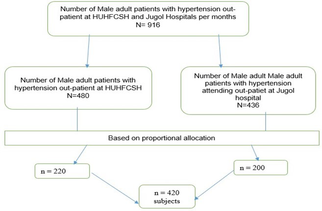 Sampling procedure: Systematic sampling techniques was used select study participants. the estimated sample was proportionally allocated to each hospital depending on the number of adult hypertensive patients attending medical out-patient department. There were 480 and 436 adult patients with hypertensive patients who visited Haramaya University Hiwot Fana Comprehensive Specialized Hospital and Jugol hospital per month respectively= 916/ 420 = 2.18~ 2. The study participants were interviewed every 2 intervals at each hospital and the first participant was selected randomly by using simple lottery method (Figure 1).