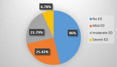 The prevalence of ED was 54% [95% CI 49.2-58.4]. The distribution of ED was mild in 105[25.42%, 95% CI 21.5-29.9] moderate in 90[21.79%,95%CI 17.7-25.7] and severe in 28[6.78%,95% CI 4.4-9.2] study participants (Figure 2).