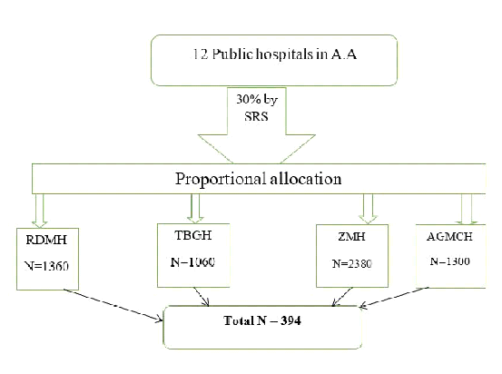 The study was conducted in Addis Ababa’s public hospitals. The city has a population density of 5,535.8 inhabitants per square kilometer and occupies an estimated area of 174.4 square kilometers. In Addis Ababa city administration there are 6 hospitals, 1 Public health laboratory and 2 health science colleges. There are also 11 sub-city health offices, which are directly accountable to their respective sub-city administration. There are also 52 hospitals in the metropolis of which 6 are owned by Addis Ababa regional health office AARHB, Five by federal government, 3 by NGO’s, 3 by Defense force and police and 35 by the private owners. There are 116 health centres owned by the city administration, and 3 by NGOs at present. There are also more than 760 private clinics at different levels [22]. According to estimates from Ethiopia’s Central Statistical Agency, the Addis Ababa Region’s total population is estimated to be 5.55 million in 2017. Females in the reproductive age group account for 35.5 percent of the overall population [6]. Eight hospitals are operated by the Addis Ababa Health Bureau, seven by the Federal Ministry of Health, one by Addis Ababa University [7]. Those hospitals have different maternity units like family planning, antenatal care, postnatal care and delivery units. There are about 650 mothers delivered in each public hospital in average per month.