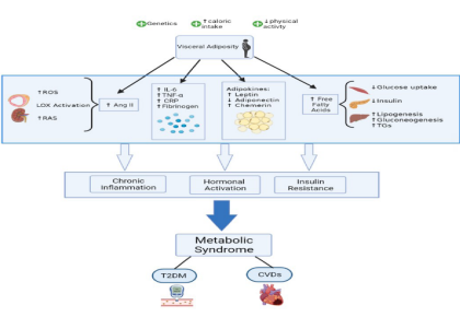 Figure 2 visually reinforces the central role of obesity particularly visceral fat as the initiating factor in MetS. As adipose tissue expands, adipocytes undergo hypertrophy and experience hypoxia, triggering apoptosis and attracting macrophages that polarize toward a pro-inflammatory M1 phenotype. These immune cells release cytokines like TNF-α and IL-6, which impair insulin signaling and fuel systemic inflammation (1). The diagram shows how this inflammatory milieu is compounded by increased reactive oxygen species (ROS), activation of lipoxygenase (LOX), and the renin-angiotensin system (RAS), leading to elevated Angiotensin II and vascular dysfunction. Simultaneously, the metabolically active adipose tissue alters adipokine profiles raising leptin, lowering adiponectin, and increasing chemerin disrupting glucose and lipid homeostasis [3]. Free fatty acids (FFAs) released from adipose stores spill into circulation, contributing to ectopic fat deposition in the liver, pancreas, and muscle, which further exacerbates insulin resistance. The image captures how these changes culminate in decreased glucose uptake and increased hepatic lipogenesis and gluconeogenesis, driving hyperglycemia and dyslipidemia. Ultimately, the convergence of chronic inflammation, hormonal imbalance, and insulin resistance leads to the full clinical expression of MetS, with heightened risk for type 2 diabetes mellitus and cardiovascular diseases. Figure 2 encapsulates this systemic dysfunction, offering a clear and integrated view of how central obesity orchestrates the metabolic collapse characteristic of MetS [10].